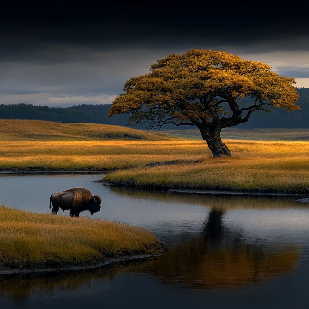 Создано на основе запроса: An oak forest in Normandy, with grass-covered fields stretching into the horizon, features a european bison dramatically set against a blue sky. The european bison stand on the grass, bathed in a soft beam of sunlight breaking through the white clouds. Moody and cinematic lighting, high contrast, National Geographic style, ultra-detailed, 64K resolution. Rembrandt lighting, chiaroscuro. --- Автоперевод: В дубовом лесу в Нормандии, с покрытыми травой полями, протянувшимися на горизонт, есть европейский бизон, резко устанавливаемый на голубом небе. Как тебе эта картинка? 🤔 https://dzen.ru/id/65c0c65c86e4f837c27b24d7 #ИИ #AI #нейросеть #midjourney #art