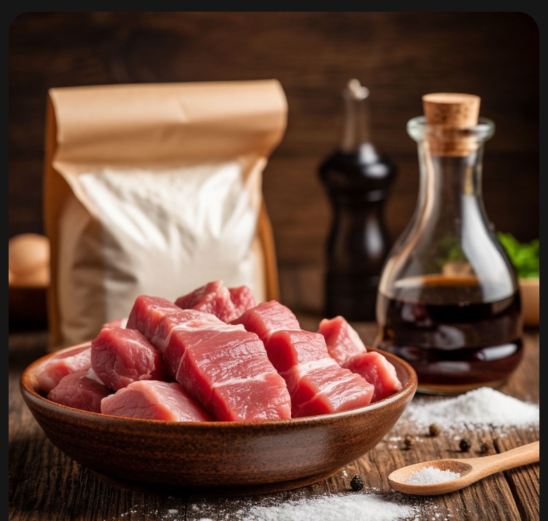 Время приготовления: ~40 минут Общая калорийность блюда составляет примерно 1978 ккал. Если поделить на 4 порции, то в одной порции будет около 495 ккал. Итак! Если вы хотите приготовить что-то яркое, сочное и насыщенное вкусами, этот рецепт — то, что нужно! Кусочки свинины, нежные внутри и с легкой хрустящей корочкой снаружи, обжаренные с овощами и покрытые густым кисло-сладким соусом, станут отличным ужином для всей семьи. Вот необходимый список ингредиентов: Основное: Свинина — 500 г Соевый соус — 100 мл Картофельный крахмал — 1 ст. л. (28 г) Пшеничная мука — 1 ст. л. (28 г) Оливковое масло — для жарки Овощи: Помидоры — 100 г Болгарский перец — 100 г Морковь — 100 г Соус: Кетчуп — 120 г Рисовый уксус — 2 ст. л. (30 мл) Сахар — 60 г Дополнительно: Рис (по желанию) Приготовление: 1. Маринуем мясо. Свинину нарезаем небольшими ломтиками, слегка отбиваем, чтобы мясо было мягче. В глубокой миске смешиваем соевый соус, крахмал и муку до однородности. Добавляем кусочки мяса, тщательн