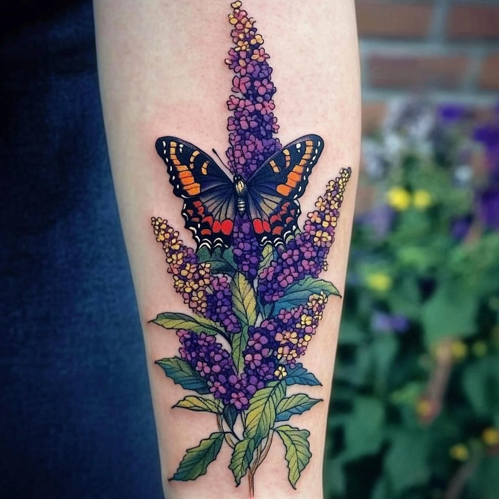 Создано на основе запроса: a tattoo that will have a black knight butterfly bush with a butterfly on it. The colors need to be vibrant and good on dark skin.