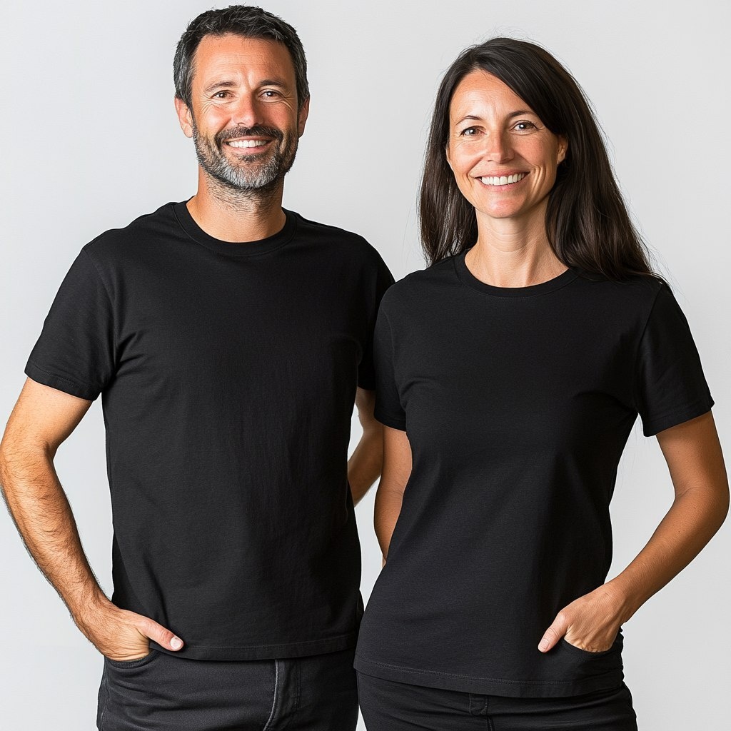Создано на основе запроса: Two people wearing t-shirts, man and woman, both smiling and looking forward, against a white background, wearing