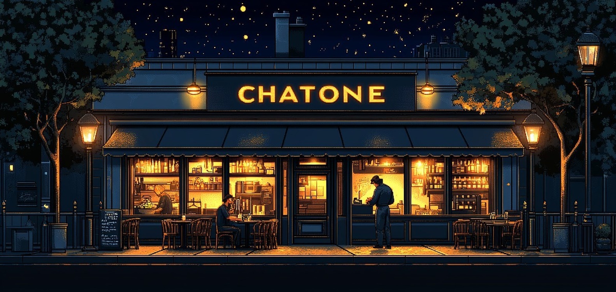 Создано на основе запроса: A 64bit videogame background image of the outside of a french restaurant. The image is during the early evening from across the street. You can see a waiter through the window standing and taking the order of a male customer who is sitting down at his table.