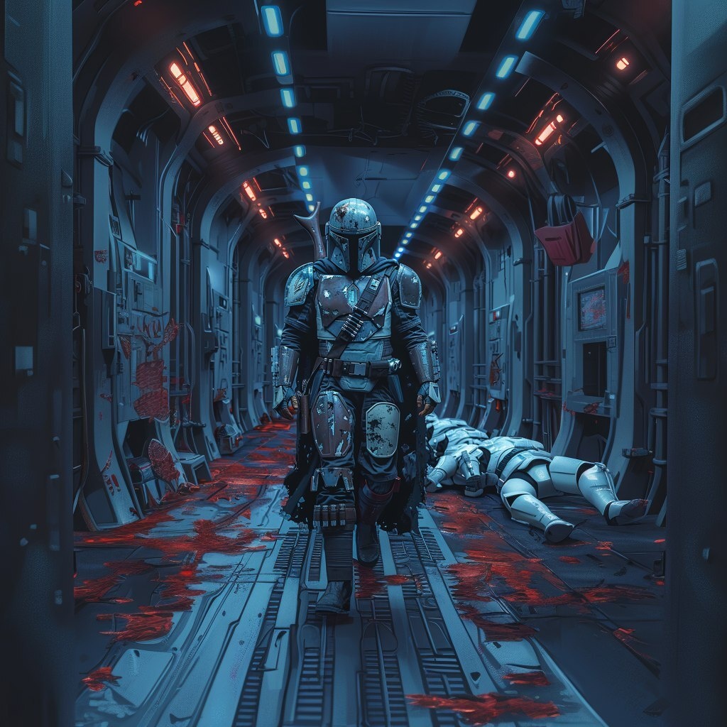 Создано на основе запроса: Star Wars bounty hunter THE MANDALORIAN , in his full costume, derelict space station, twisted biomechanical corridors from star wars with Imperial designs, blue and red emergency lights, dead stormtroopers remains on the floor, comic horror, sci-fi gothic, cel-shaded ink style, heavy linework, monochrome blue and black color scheme, dramatic low angle --- Автоперевод: Охотника за головами «Звездные войны», в своем полном костюме, заброшенной космической станции, извращенных биомеханических коридорах из «Звездных войн» с имперскими рисунками, синими и красными аварийными огнями, мертвыми штурмовиками остаются на полу, комический ужас, научно-фантастические готические, стиль чернила Cel, тяжелые линейки, монохромная синяя и черная цветовая схема, драматические низкие уголки, уколотые чернила, тяжелые линейки, монохромная синяя и черная цветовая схема, драматические нилые уголки. Как тебе вариант? 🤔 https://dzen.ru/id/65c0c65c86e4f837c27b24d7 #ИИ #AI #нейро