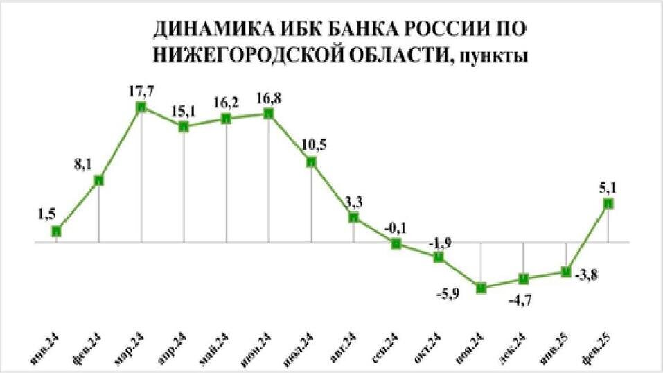 В феврале 2025 г. сводный индикатор бизнес-климата (ИБК Банка России) Нижегородской области повысился до 5,1 пункта. Месяцем ранее показатель составлял -3,8 пункта, сообщил заместитель губернатора региона Егор Поляков.