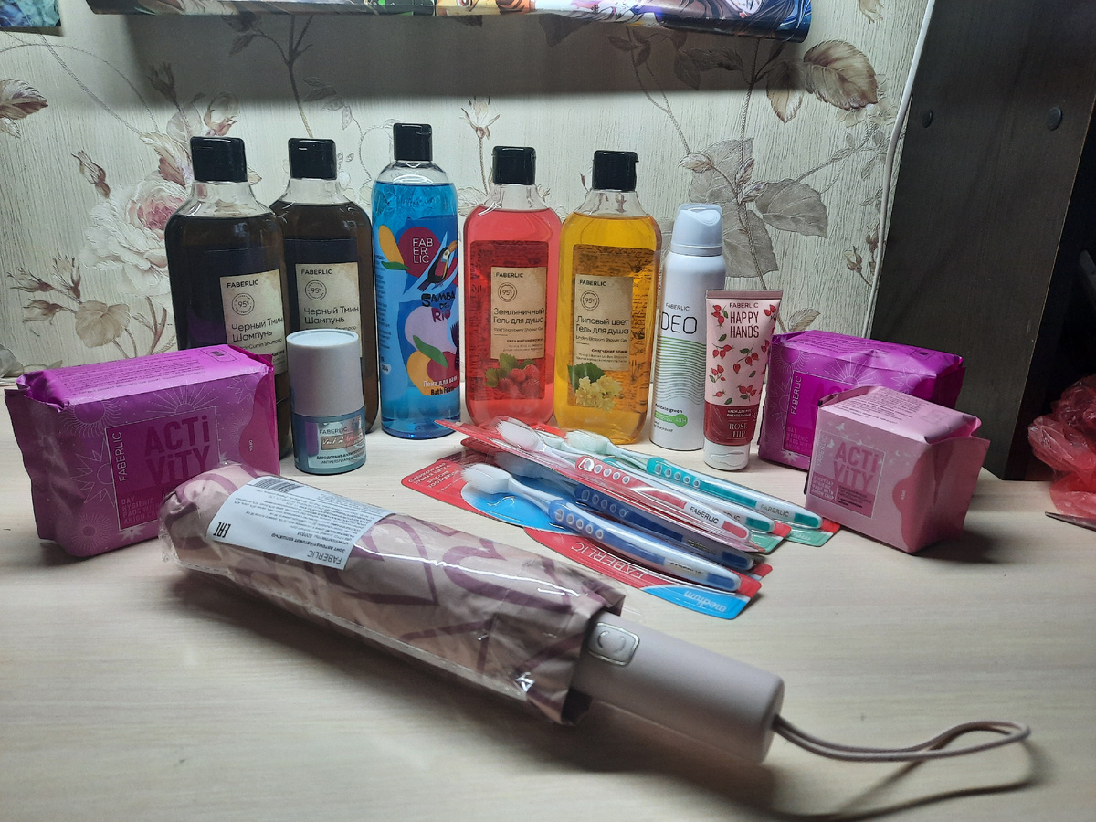 Здравствуйте друзья! Получила свой дополнительный заказ по 5 каталогу Фаберлик. Обычно заказываю один раз за каталог. Но т.к. скидка уже 26 % и чтобы ее не терять сделала дополнительный дозаказ до 50 баллов. Вот такие силиконовые щётки за 109 рублей. Дневные и ежедневные гигиенические прокладки 199 рублей. Гели для душа по 139 рублей. Пена для ванны 179 рублей. Шампунь "Чёрный тмин" 139 рублей. Сказали очень хороший, надо самой попробовать . Женский дезодорант спрей 179 рублей и мужской шариковый дезодорант 149 рублей. Крем для рук 89 рублей. И себе заказала зонт. Зонт мне вышел за 1039 рублей. Хороший качественный зонт с красивым принтом. А то свой в том году где-то на лавочке забыла и вспомнила только через 2 дня. Вот такой заказ на 2888 рублей. За заказ заработала 410 рублей.
