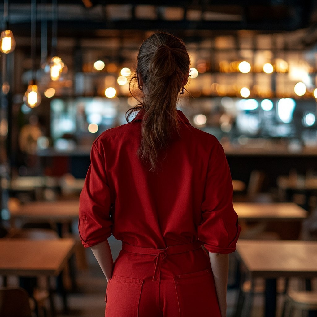 Автоперевод: Крупным планом женщины-официанта, увиденного сзади в ресторане в промышленном стиле, в красном рабочем комбинезоне.