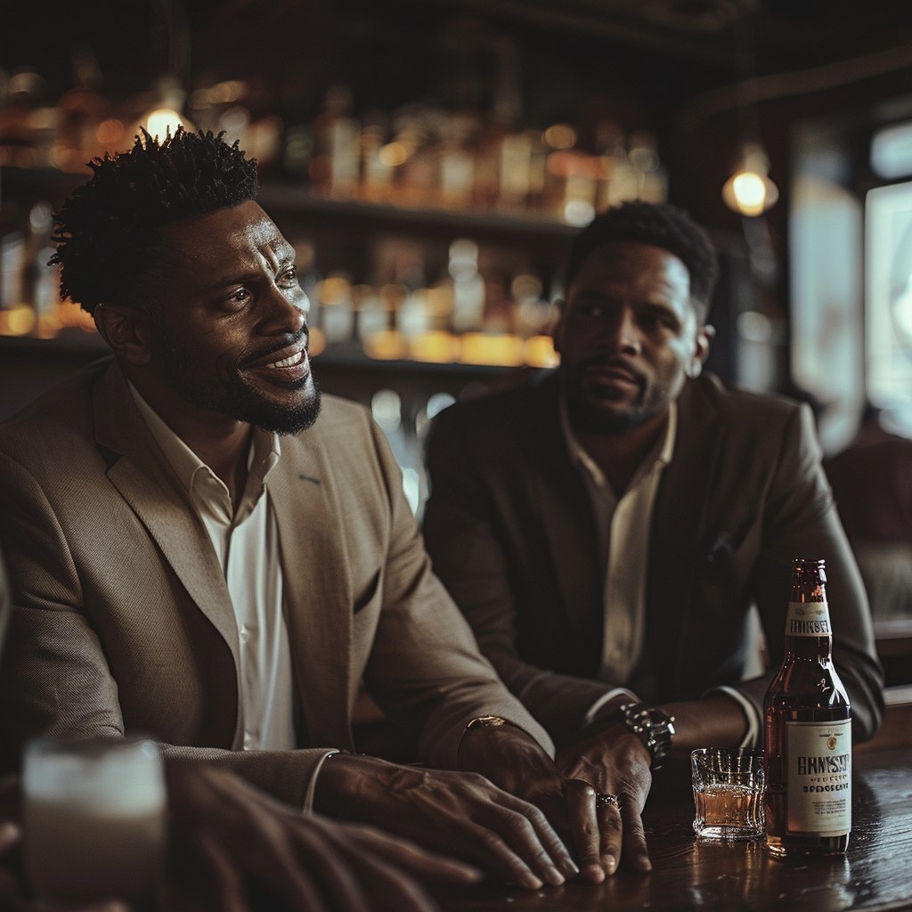 Создано на основе запроса: Actor Michael Ealy and actor Winston Duke sitting at a bar together getting ready to drink. A bottle is on the bar between them on the bottle is the word HENNESSEY. The bottle MUST have the word HENNESSEY spelled exactly right. Both of the men are dressed in 1980 business casual attire. The image should be cinematic and something one would see as an image for an ad campaign for a movie about HENNESSEY. The men should look refined and sophisticated. The bottle must have a HENNESSY label on it. Cinematic, shot on film, IMAX, award-winning photo
