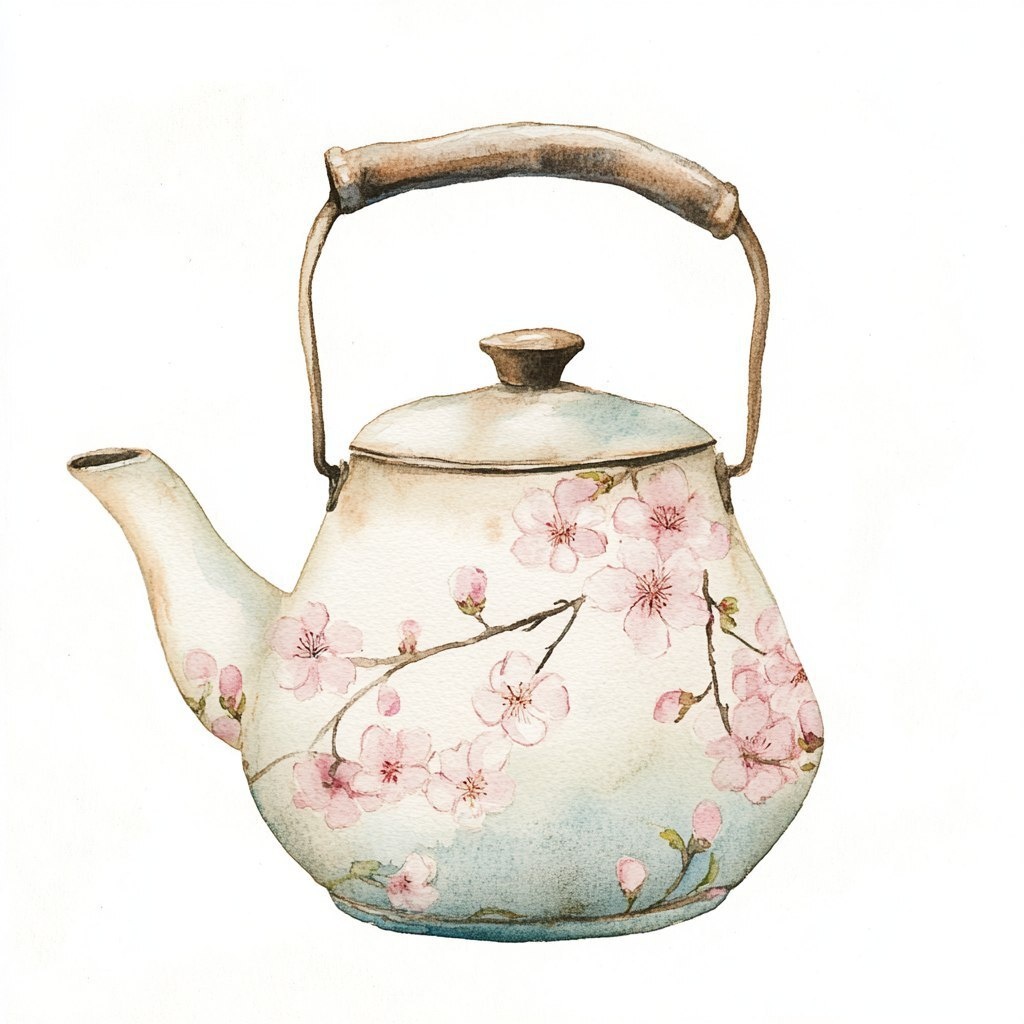 Создано на основе запроса: A watercolor illustration of a single tea kettle with cherry blossom design. The kettle decorated with pink cherry blossom design, evoking the freshness of spring. The cherry blossoms are subtle, with delicate petals scattered across the kettle. The design should be simple, clean, and elegant, capturing the essence of spring in its freshness and lightness, clipart, on white background