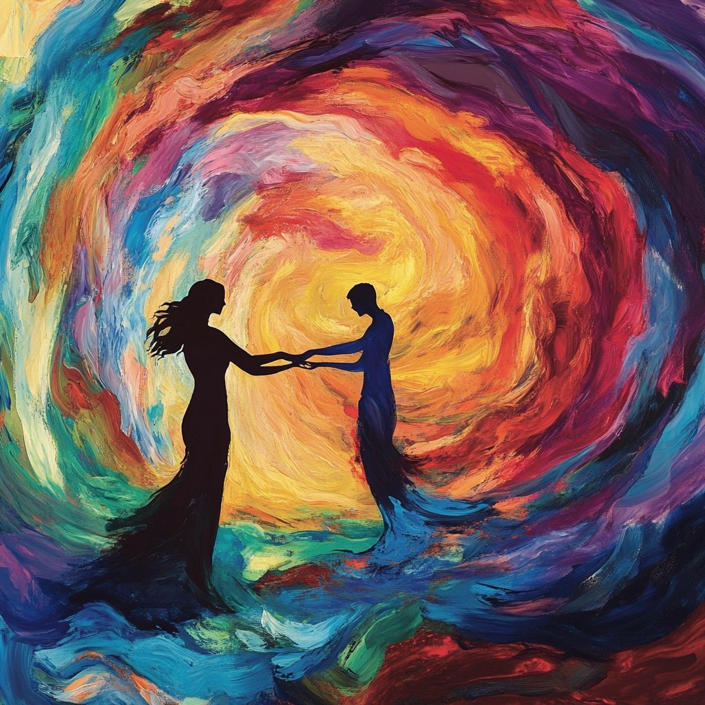 Создано на основе запроса: Create a vibrant and abstract image of swirling colors, representing intense emotions, with elements of love and longing intertwined. Include silhouettes of two figures reaching out to each other, surrounded by a dreamy, ethereal background that evokes a sense of yearning and desire.