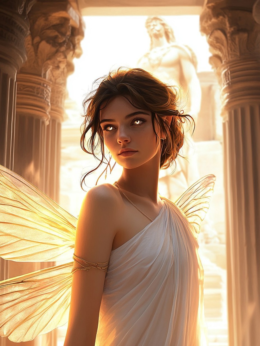 Создано на основе запроса: Ancient Greek fairy female Priestess with brown hair and sharp ears. She has peach and yellow dragonfly wings. She is in an open temple with columns with the statue of Zeus at the background. Her eyes have a shining white color. Wearing a white himation and hold jewlery. The sky is completely peach colour. Hyperealistic.
