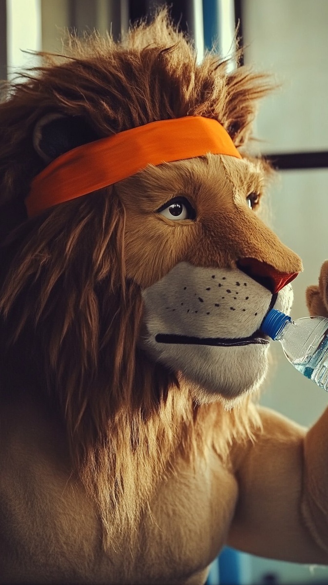 Создано на основе запроса: A macro close up view of a lion mascot pouring gatorade from a gatorade squeeze bottle onto his face while in a