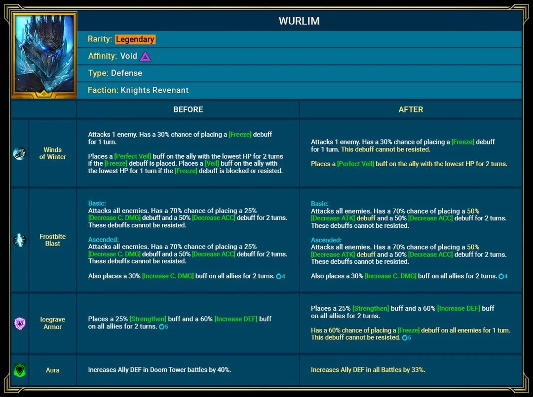 Анонсировали ребаланс Вурлима и Ашнара Вурлим - A1 Холодный ветер Атака по врагу. С вероятностью 30% накладывает Заморозку на 1 ход. Этот штраф невозможно отразить. Накладывает на союзника с самым низким здоровьем Густую пелену на 2 хода. - A2 Морозный взрыв Атака по всем врагам. С вероятностью 70% накладывает Штраф атаки 50% и Штраф меткости 50% на 2 хода. Эти штрафы невозможно отразить. Накладывает на команду бонус крит.урона 30% на 2 хода. - А3 Ледяная Броня Накладывает на команду Усиление 25% и Бонус защиты 60% на 2 хода. С вероятностью 60% накладывает на всех врагов Заморозку на 1 ход. Этот штраф невозможно отразить. Ашнар Базовая форма - А1 Огненная дуга Атакует врага 3 раза. Каждый удар с вероятностью 50% продлевает все штрафы на цели на 1 ход. Если изначальный шанс не срабатывает, каждый удар с вероятностью 100% продлевает действие Выжигания здоровья цели на 1 ход. Лечебный огонь (пасс.) Когда накладывает Выжигание здоровья в основной форме, увеличивает собственные показа