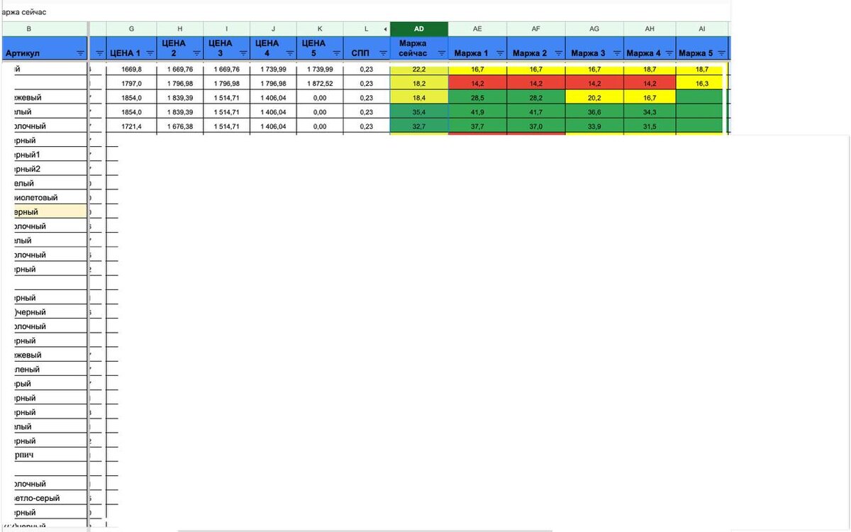 Про акции уже много писали но, к сожалению не участвовать в них не получится и наша задача сейчас - лавировать между условиями, пытаясь сохранить маржу. Задача немноооожко усложняется тем, что на ВБ прямо сейчас параллельно идет 5 акций, а с 28 марта к ним добавится еще одна!! Поэтому нам помимо своих показателей, еще нужно учесть: - буст каждой акции - цены/маржа в каждой акции- стратегия по ассортименту в каждой акции - изменение ДРР в зависимости от различных комбинаций между участием/не участием в акциях НА ЧТО МЫ СМОТРИМ, ПРИНИМАЯ РЕШЕНИЕ ОБ УЧАСТИИ: Требуемые скидки, есть ли запас по марже? Мы с командой для этих целей используем таблицу, раньше она была сильно меньше, но сейчас нам надо просчитывать 5-6 акций на весь ассортимент, поэтому она стала шире! Скачиваем условия по каждой акции, вставляем в таблицу и получаем сводные данные по марже на каждый артикул с учетом участия в каждой из текущих акций. По каждому артикулу принимаем решение отдельно, с учетом маржинальности и сле