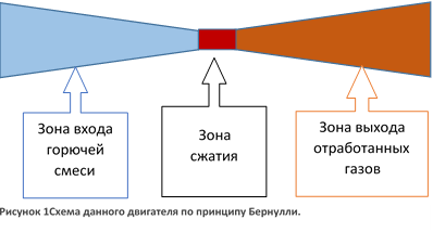 В основе работы данного двигателя лежать протекающие процессы законов термодинамики и принцип Бернулли. Читая принцип Бернулли движения жидкости в изменяющихся объемах сосудов, я сделал вывод, что вот он принцип работы данного двигателя, напоминающий принцип работы двухтактного двигателя.