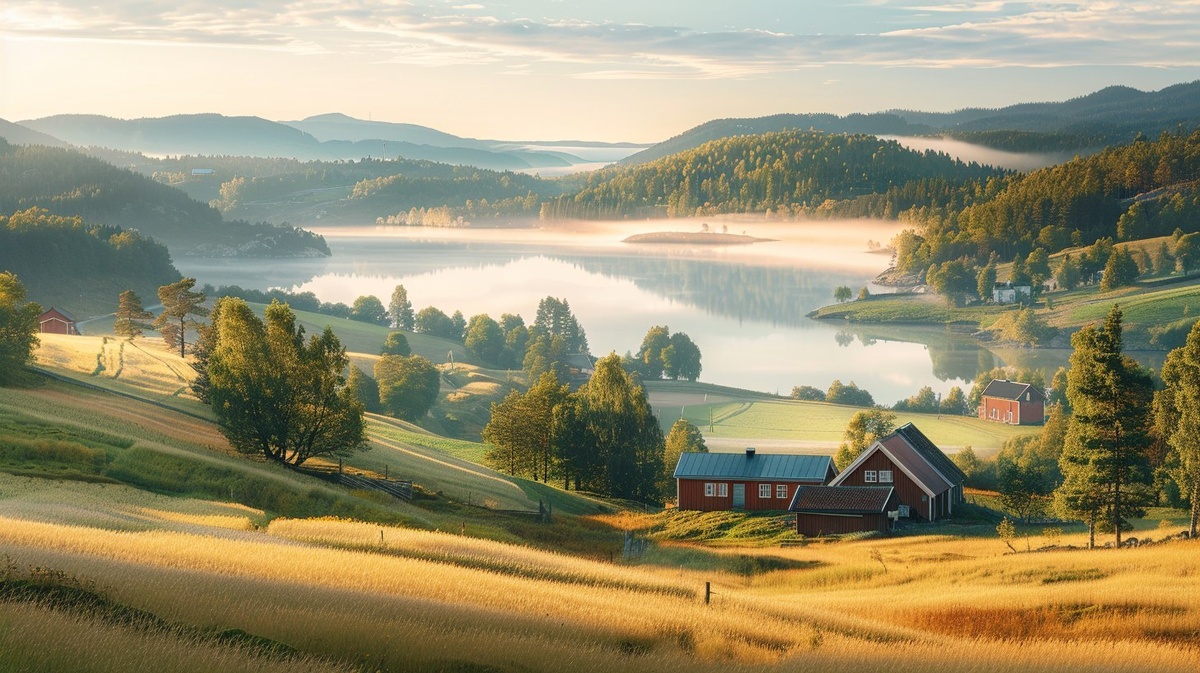 Создано на основе запроса: A high-resolution scenic landscape of the Ringerike region, with Tyrifjorden in the center, surrounded by forested hills and farmland. Light fog over the water and golden early morning light creating long shadows. Traditional Norwegian buildings in the distance. Created Using: Canon EOS R5, landscape photography, natural Norwegian tones, Ringerike landscape realism, high detail nature texture --- Автоперевод: Живописный ландшафт региона Рингерики с высоким разрешением с Тирифджорденом в центре, окруженный лесными холмами и сельскохозяйственными угодьями. Круто выглядит? 🤔 https://dzen.ru/id/65c0c65c86e4f837c27b24d7 #ИИ #AI #нейросеть #midjourney #art