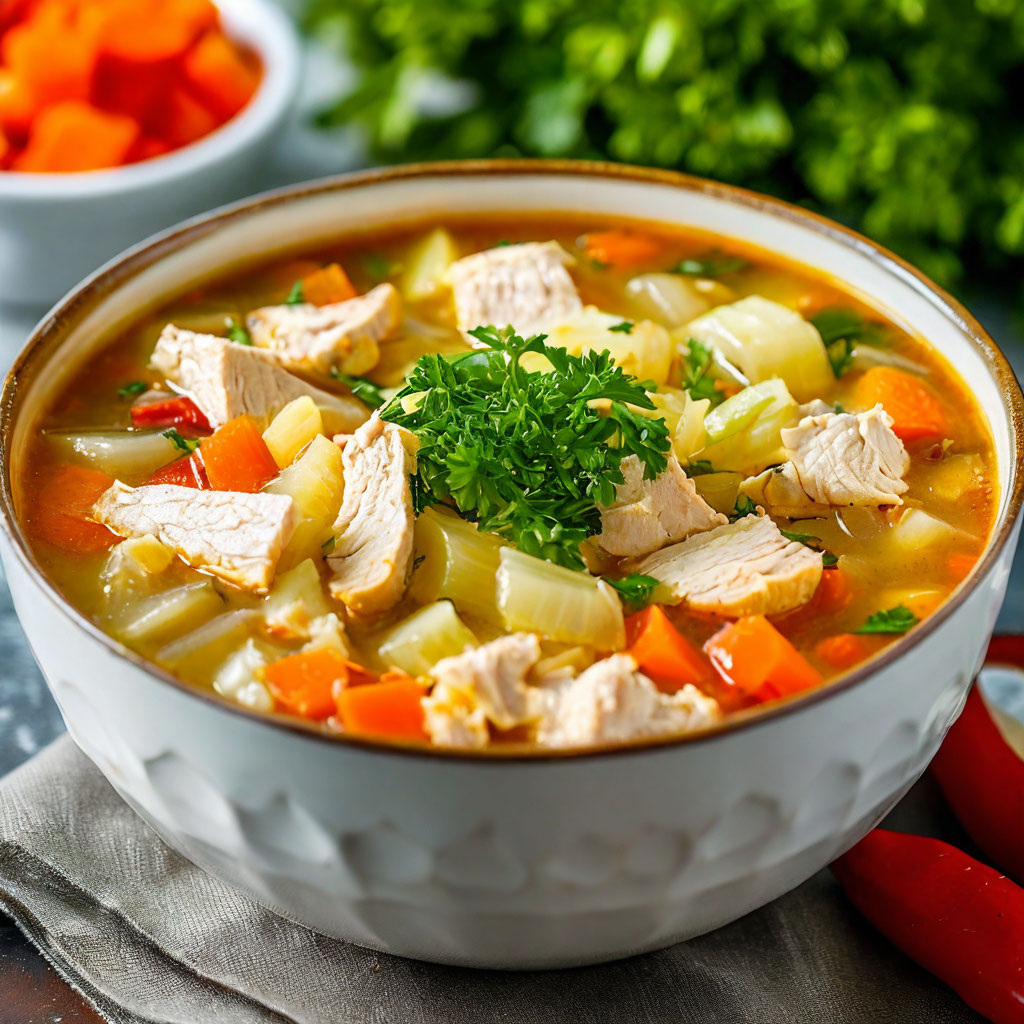Диетический суп из куриной грудки – это легкое, полезное и вкусное блюдо, которое идеально подходит для тех, кто следит за своим питанием! Он богат белком, витаминами и клетчаткой, при этом содержит минимум калорий. Этот суп легко приготовить, он получается ароматным и насыщает надолго. Начнем с подготовки овощей и курицы. Куриную грудку (615 г) промойте и нарежьте небольшими кубиками. Лук репчатый (150 г) очистите и мелко нарежьте. Морковь (150 г) очистите и нарежьте кружочками или полукружочками. Сельдерей корневой (200 г) очистите и нарежьте небольшими кубиками. Перец сладкий (100 г) очистите от семян и нарежьте соломкой. Цветную капусту (100 г) разберите на небольшие соцветия. В большую кастрюлю налейте воду и доведите ее до кипения. Добавьте нарезанную куриную грудку в кипящую воду. Снимите пену, которая образуется на поверхности. Добавьте нарезанный лук и морковь в кастрюлю с курицей. Варите суп на медленном огне в течение 15-20 минут. Добавьте сельдерей корневой и сладкий перец