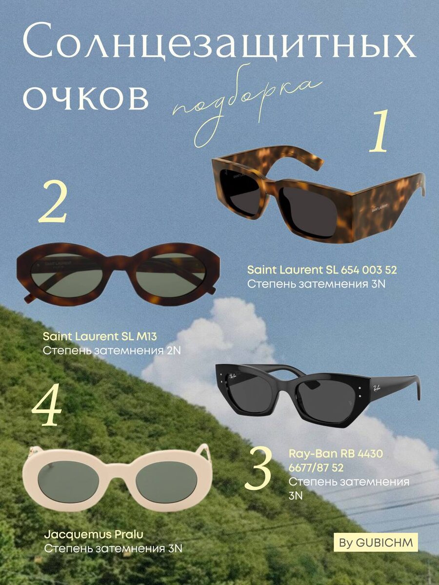 Знаю, что многие санскрины раздражают кожу вокруг глаз, поэтому удобнее всего защищать глаза солнцезащитными очками. Собрала подборку из очков, которые показались мне интересными + со степенью затемнения 2-3N, они подходят для солнечных дней. Ниже расскажу подробнее, как выбрать солнцезащитные очки, которые уберегут глаза от ультрафиолета и преждевременных морщин. Обращайте внимание на специальную маркировку на дужках очков : UV 400 — фильтрует 99% УФ UV 380 — фильтрует 95% УФ Степени защиты: 0 - пропускают солнечный свет на 80-100%, незначительно уменьшают поток солнечного света. Это очки для коррекции зрения, их можно носить в помещении или ночью. Как правило, они прозрачны или слабо окрашены. 1 - пропускают свет на 43-80%, подходят для использования при переменных погодных условиях 2 - 18-34% светопропускания, подходят для солнечных дней. Самый распространенный вариант для ношения в ясной погоде 3 - от 8 до 18% пропускания, защищают глаза в очень солнечные дни, также