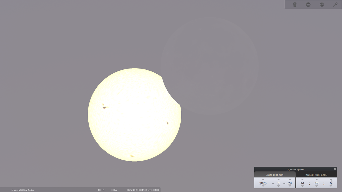 Максимальная фаза затмения в Москве наступит в 14 часов 49 минут (по Московскому Времени), а всё затмение здесь продлится 48 минут — с 14:25 по 15:13.