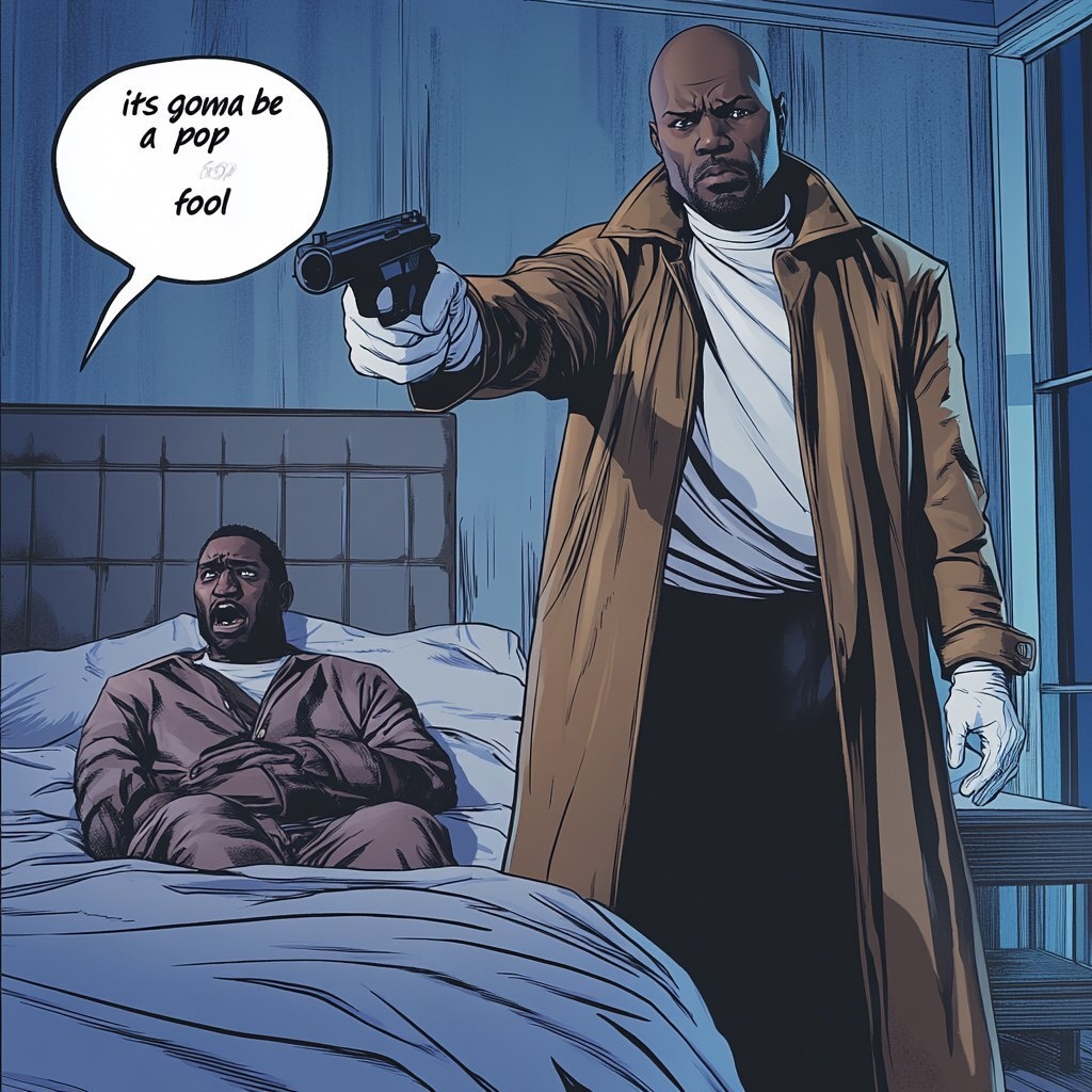 Создано на основе запроса: a tall baldheaded balck man wearing a long sleeve white turtle neck shirt witha long brown trench coat and black pants boots wearing white gloves holding a shotgun pointing it a black man wearing pajamas sitting in bed looking terrified while the man holding the gun says "its gonna be a pop fool"