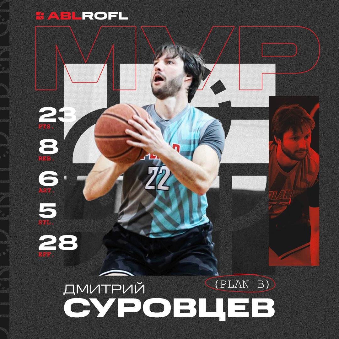 MVP недели Суровцев Дмитрий (Plan B) vs Duke Blue Devils Rofl 60:56 23 очка, 8 подборов, 6 передач, 5 перехватов, 28 эффективность 💪Главным героем первой игровой победы Plan B в сезоне стал Дмитрий Суровцев. Plan B и Duke Blue Devils сыграли очень богатый на события и эмоции матч. Баскетболисты спорили с судьями, с соперниками и даже с сокомандниками и играли так страстно как будто это был матч плей-офф. В этом сверхэмоциональном, сумбурном, с большим количеством ошибок матче Суровцев был воплощением спокойствия и уверенности. Дмитрий руководил действиями команды как первый номер, не забывая при этом забивать самому, несмотря на плотную опеку Ямбаева. Качели по счету продолжались до последних минут встречи, где Plan B удалось вырваться вперед на несколько очков. Дмитрий реализовал на последней минуте 5 из 6 штрафных, гарантировав победу команде. 1️⃣@ABL Moscow
