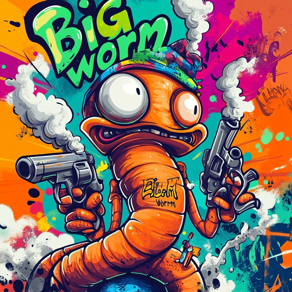 Создано на основе запроса: A cartoon-style worm with exaggerated worm features – long, segmented body, no legs, expressive eyes – wearing a bandana over its face like a mask. The worm has tiny cartoon arms holding two guns, with colorful smoke coming from the barrels. The words "Big Worm" are subtly formed within the smoke. The background is vivid and bright with a graffiti-style, urban street art vibe – spray paint textures, bold outlines, street colors. Hip-hop inspired, playful and edgy.