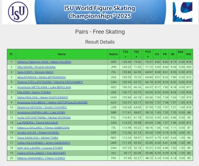 Первые медали на ЧМ в Бостоне разыграли спортивные пары. Прошлогодние случайные чемпионы мира Деанна Стеллато-Дудек и Максим Дешам (Канада) показали свою полную профнепригодность. Остались без каскада, потому что после тройного тулупа Деанна прыгнула только перекидной. Выброс риттбергер из-за приземления на руки вышел на минуса. Всю программу теряли, где только могли. Ну не было и нет у них качественных элементов. 132.44 балла (199.76) и пятое место для них слишком жирно. Пусть идут в цирк (Дю Солей) и там их научат прыгать. Анастасия Метелкина и Лука Берулава (Грузия) дважды запрыгивали на пьедестал ЧЕ после исполнения произвольной программы, но на ЧМ такая тактика не прокатила. Не смогли качественно исполнить обязательные элементы, да и не до эмоций им уже было. Получили от судей 130.53 балла - шестое место по произвольной и в итоге (202.21) - четвертые. Сара Конти и Никколо Мачии (Италия) выступали последними. Стабильно третьи - и в короткой и в произвольной. С суммой 135.86 ба