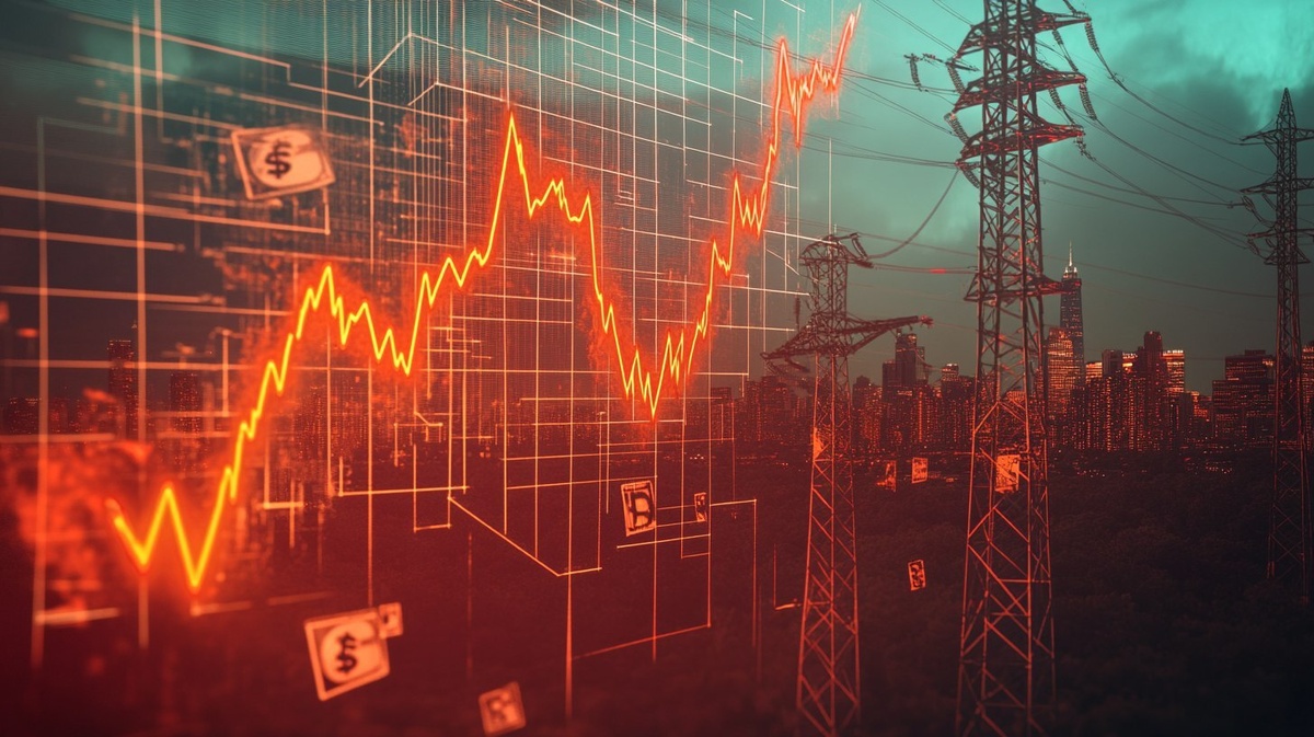 Создано на основе запроса: map of New York State with glowing power lines and utility poles. A red arrow or graph line rises steeply across the state map, symbolizing increasing electricity costs. Dollar signs float upward with the graph line. The background has a slightly moody or stormy tone to convey urgency, with glowing orange and green hues indicating heat or expense. Include a cityscape of buffalo NY in the background to anchor the state’s identity.