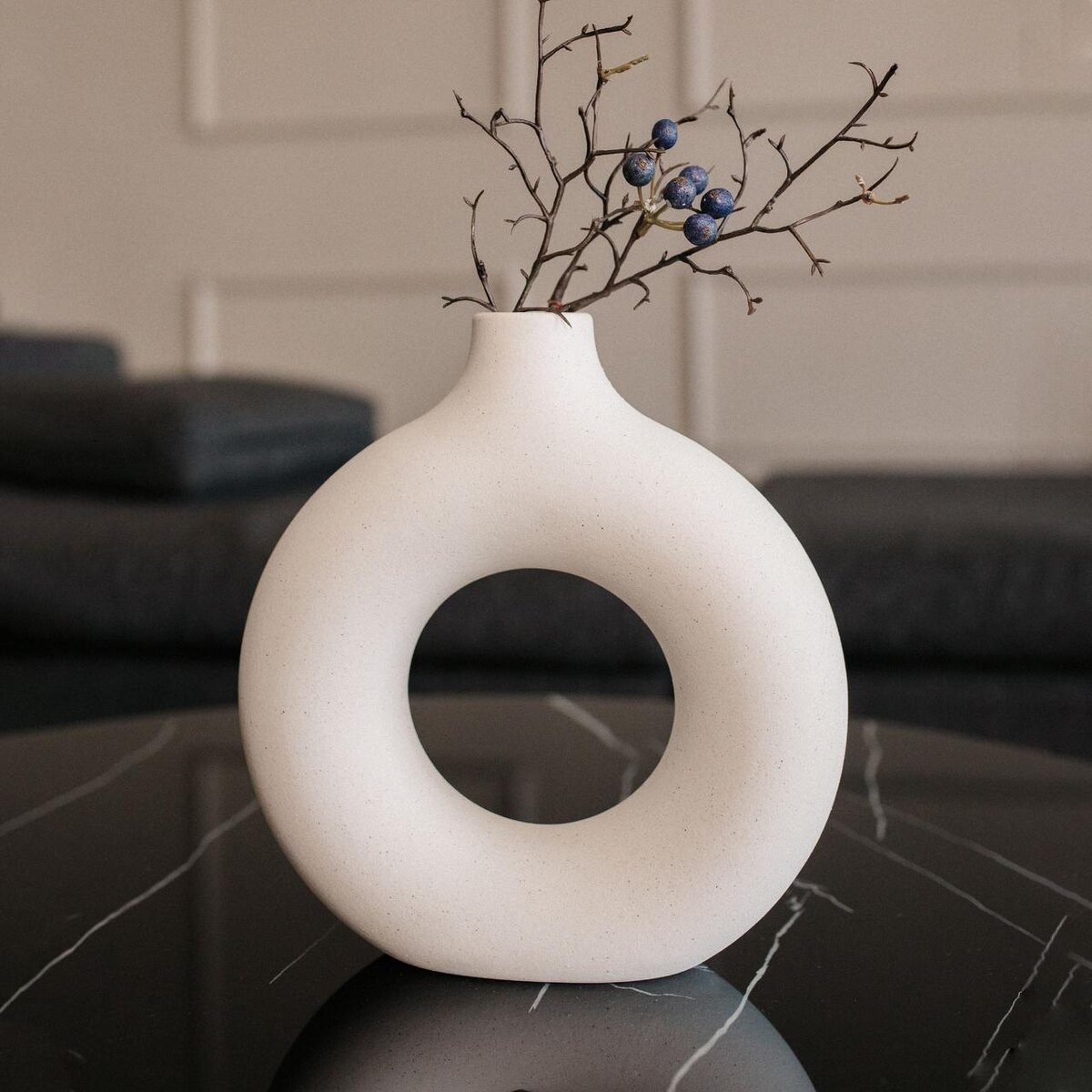 Высокая узкая ваза и прозрачного стекла выглядит стильно. Размер 30 см. Ну а вазы бублики уже немного приелись. В стекле такая форма смотрится интереснее, чем в керамике. Размер вазы 16 см. Ценники тоже красные. На эти вазы тоже красные ценники.