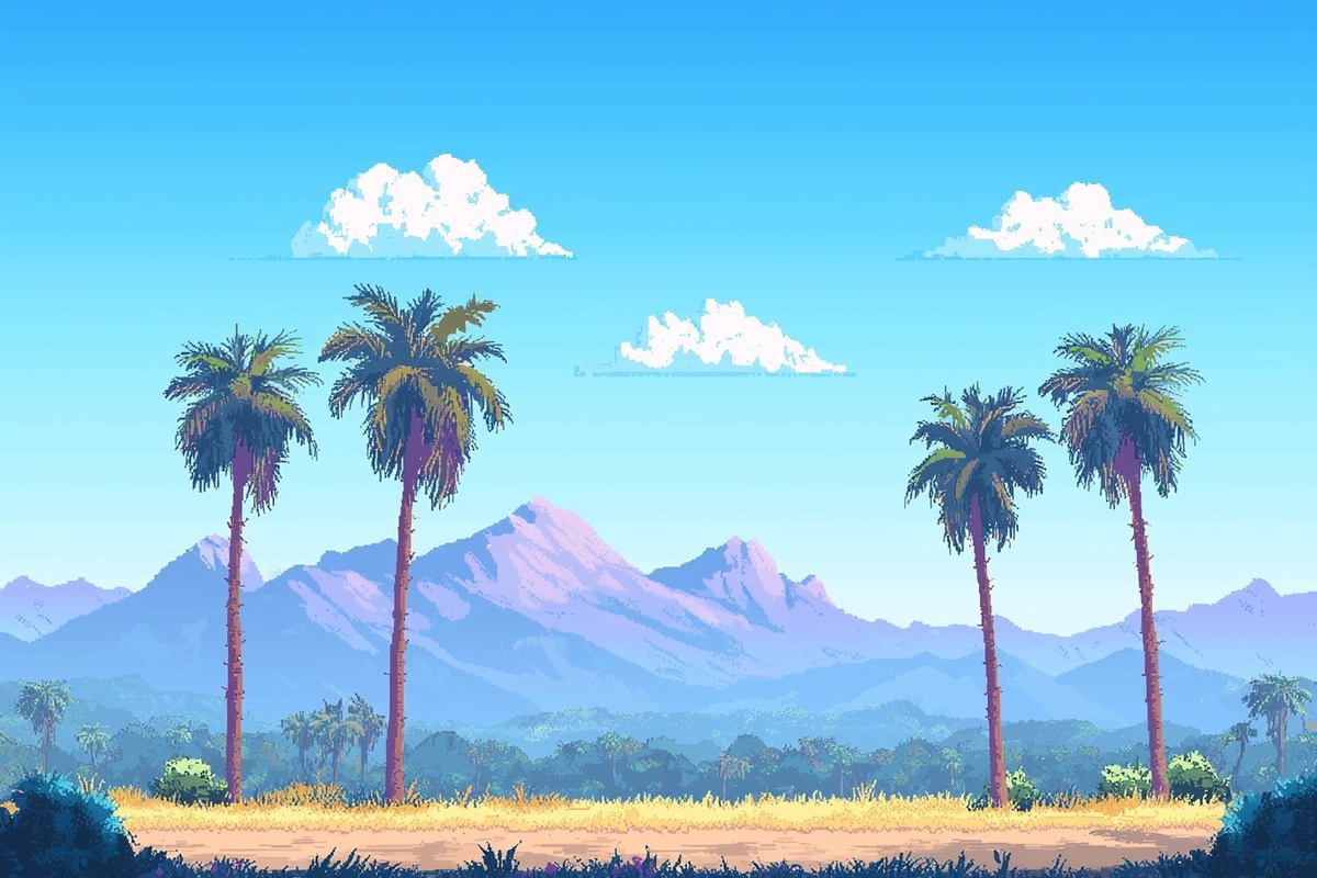 Создано на основе запроса: flat view pixel catroon stardew valley illustration of light blue sky with couple single clouds on the sky, and mountain, and palm trees also, have a wide negative space on the upper side,