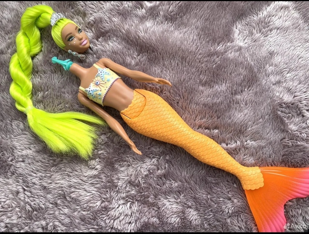 Эту девочку мне повезло взять совершенно случайно. Я искала русалочье тело от Одиль с розовыми волосами. Хотела сгибридить Пинки, а нашла замечательное объявление, в котором хранительница отдавала нужное мне тело, и в этом же объявлении была голова от Барби Экстра с зелёными неоновыми волосами. Жаль только, что у хвоста ограничена подвижность в коленном суставе (видела у более бюджетных кукол). По скилтону всё совпало как родное. Хранительница даже по моей просьбе надела голову на тело. А все вместе мне обошлось всего в 900 р. вместе с пересылкой. Девочка получила имя Неон. Её дебют будет летом. А у Ирис и Андрея тоже будет продолжение истории.