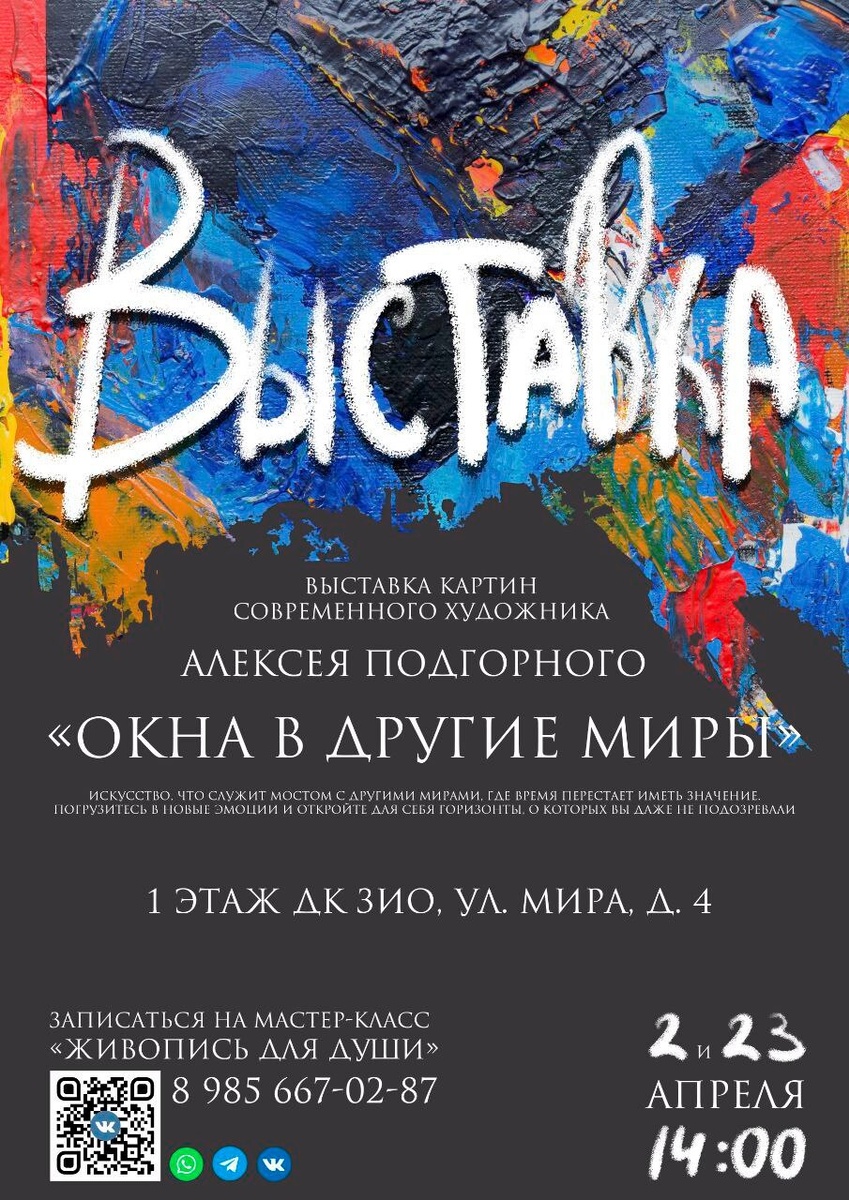 🎨 Открытие выставки Алексея Подгорного «Окна в другие миры». 💬 31 марта на 1 этаже Дома культуры ЗИО открывается уникальная выставка современного искусства. Алексей Подгорный приглашает вас в путешествие сквозь пространство и время, где эмоции становятся мостом в параллельные реальности. Его работы погружают в миры, где время теряет силу, а каждый мазок открывает новые горизонты восприятия. 📆 Дополнят событие мастер-классы «Живопись для души» 2 и 23 апреля, 14:00. 🎫 Успейте записаться через WhatsApp, Telegram: 8-985-667-02-87 или в личные сообщения ВК: https://vk.com/podg0 Откройте для себя искусство, которое меняет реальность! Приходите и проведите свой досуг с пользой и удовольствием! Будем рады видеть Вас на мероприятиях нашего Дома культуры. 📍 Мы находимся по адресу г.Подольск, ул. Мира 4, Дом культуры ЗИО. Часы работы: ежедневно с 09:00 до 22:00. #Подольск #выставка_картин #КультураПодмосковье #современное_искусство #выставка