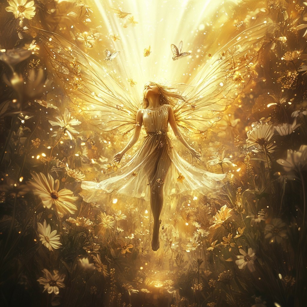 Создано на основе запроса: A realistic fairy standing in the present moment, surrounded by blooming flowers and golden light. Their feet are rooted in the earth, and their hands are open to receive love.