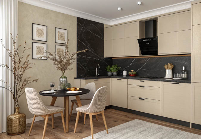 О, это элегантное и смелое сочетание. Черный всегда добавляет динамики и драматичности, а бежевый оттенок же наоборот, уравновешивает, чтобы дизайн кухни не казался слишком мрачным. Для бежевой кухни в интерьере можно добавить черную фурнитуру, раковину или же стеновую панель. Это точно будет смотреться стильно и современно. Тут есть только один подводный камень — не переборщить с черным, иначе будет слишком много драмы и сочетания цветов не будут смотреться уравновешенно.
