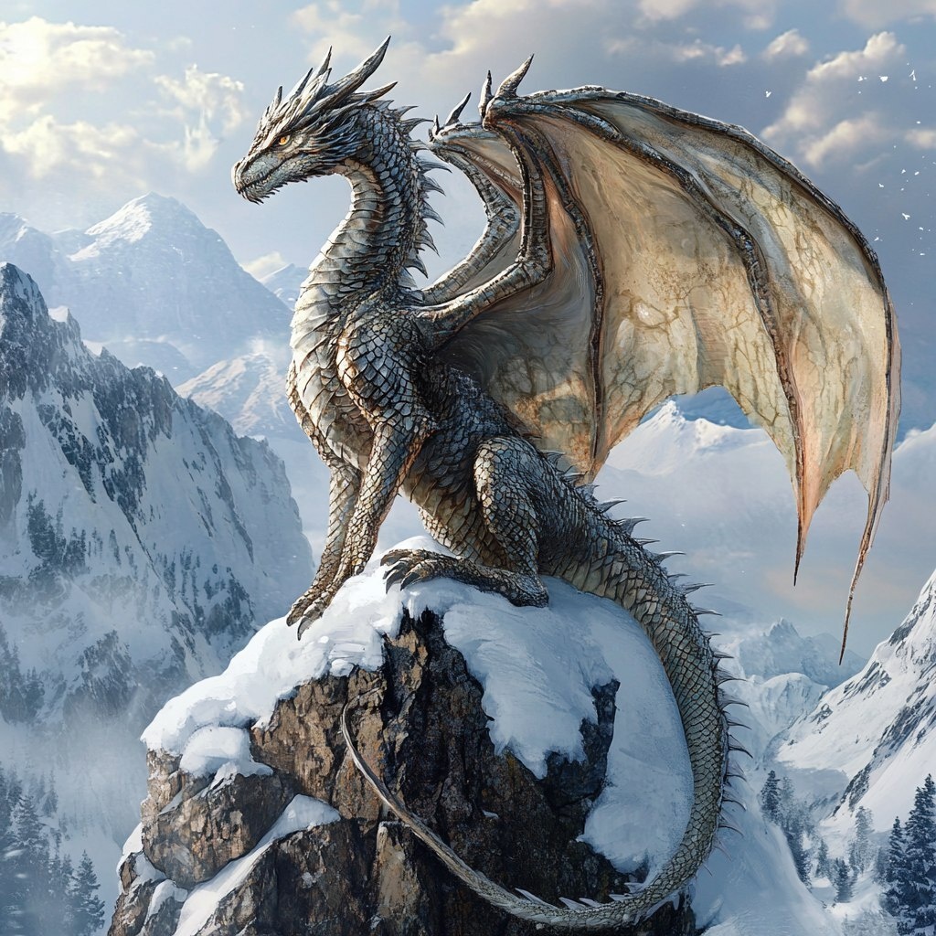 Создано на основе запроса: a dragon with metallic scales perching on a snowy rock