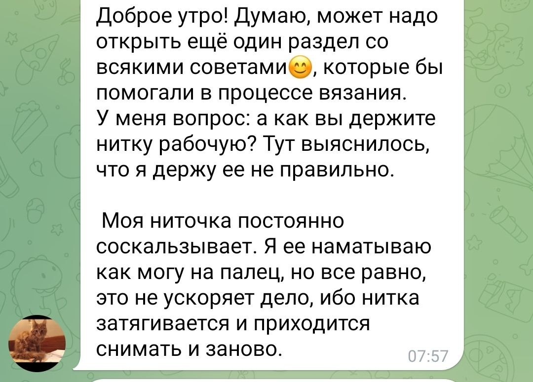 Обсудим? Недавно в чате совместника, где мы вяжем юбку крючком, зашел разговор о том, как каждый из нас держит рабочую нить. У всех свои хитрости (делюсь несколькими в фотографиях выше) Чат — это же не только поддержка и обратная связь от меня, но и возможность делиться успехами, трудностями и обсуждать вязальные лайфхаки в тёплой компании. ➿Присоединиться к нам можно здесь➿ Скоро подведу итоги и расскажу, сколько всего полезного мы успели разобрать за это время (спойлер: очень много! 😉). Кстати, о полезностях и объяснении… За годы работы в проекте «Московское Долголетие» мои любимые ученицы приучили меня разжевывать каждый шаг, предугадывать сложные моменты и возможные вопросы. Ведь у нас занимаются более 200 человек с разным уровнем подготовки, поэтому важно, чтобы каждому было понятно Этот подход даже повлиял на мою новую книгу — если раньше хватало 50 фото для мастер-класса, то сейчас их больше 150! Надеюсь, всё уместится 😅 И вернемся к началу, в следующем посте размещу виде