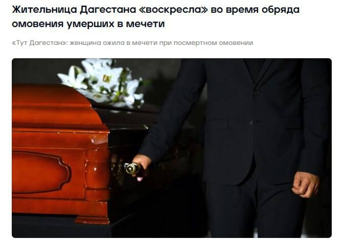 Женщина «воскресла» на собственных похоронах, сообщают СМИ. Женщина в Дагестане «воскресла» в мечети, куда ее привезли для омовения после остановки сердца. Она проснулась, испугалась и потеряла сознание. Врачи диагностировали «синдром Лазаря» — спонтанное восстановление сердечной деятельности после констатации смерти. 👉🏻Новости №1 в Ростове 💌Прислать новость/фото
