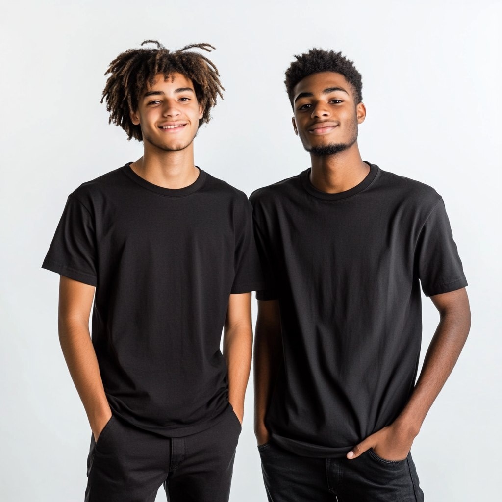 Создано на основе запроса: A pair of stylish T-shirts worn by interested young men against an all-white background. The shirts are black, designed for both men's and women's styles. They are turned sideways to highlight their outfits and show off details like straps or crew necks. Their faces show expressions of happiness and confidence. --- Автоперевод: Пара стильных футболок, которые носят заинтересованные молодые люди на все белом фоне. Какое твое впечатление? 🤔 https://dzen.ru/id/65c0c65c86e4f837c27b24d7 #ИИ #AI #нейросеть #midjourney #art