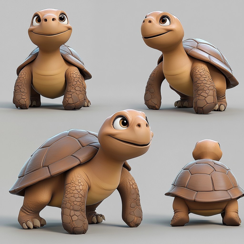 Создано на основе запроса: A friendly Galapagos tortoise with a Pixar-style character design. 3D model created with C4D modeling software. It's a cartoonish figure with simple shapes. The face is round and the eyes are large and expressive. Three views: front, side, back, and solid color.
