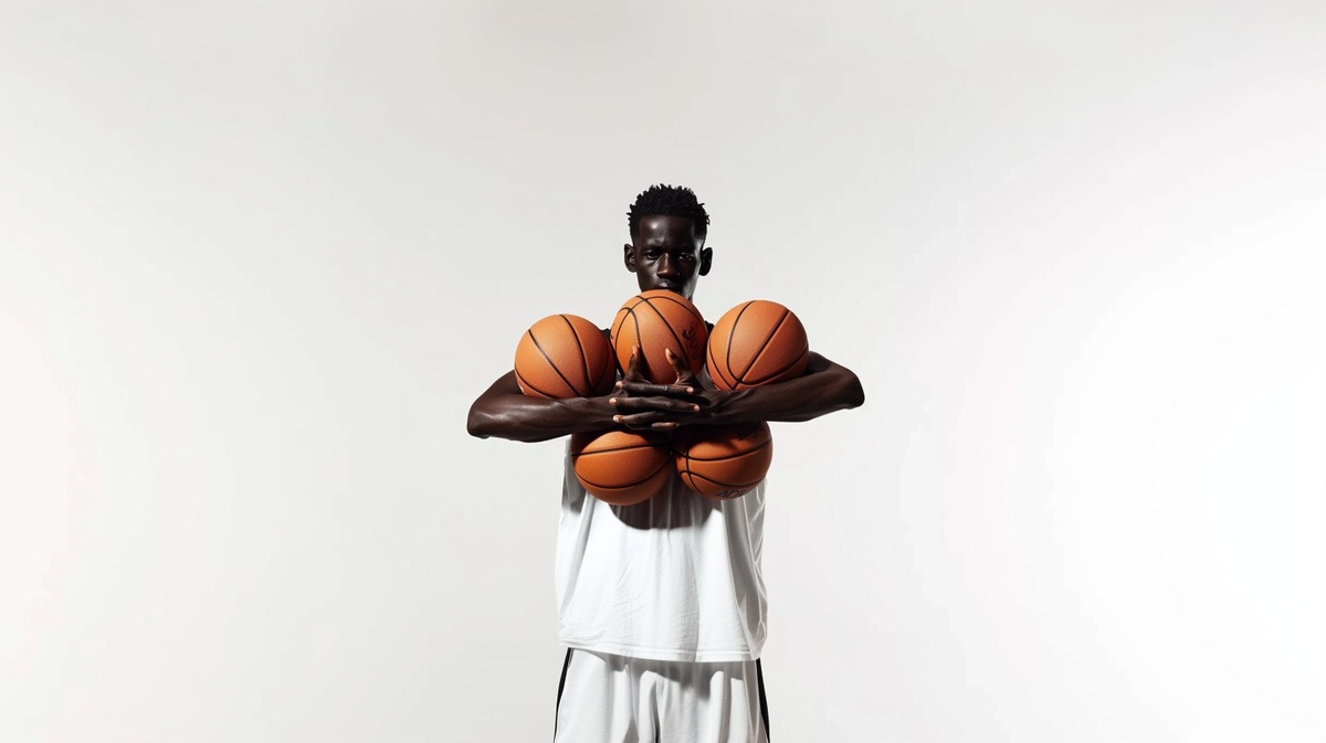 Создано на основе запроса: A black male athlete holding 8 basketballs in his hands, his face completely hidden. He stands on a pure white background. The image has a high level of detail, with realistic lighting and textures. The composition focuses on the subject and the basketballs, with no additional elements.