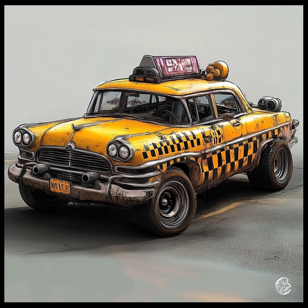 Создано на основе запроса: concept art for a stylised cute vintage nyc yellow cab, quad headlights, plymouth fury chequer cab, quad headlights, souped up for mad max style wasteland use