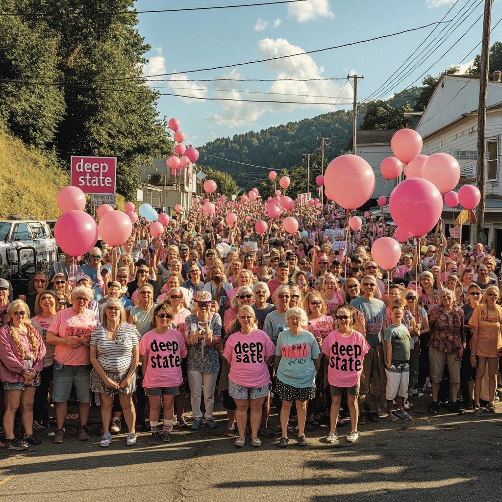 Создано на основе запроса: panoramic photograph of thousands of people standing on a small town street all wearing t-shorts that says "deep state". Everyone is happy with children, elderly people and infant celebrating with balloons in the air and party atmosphere