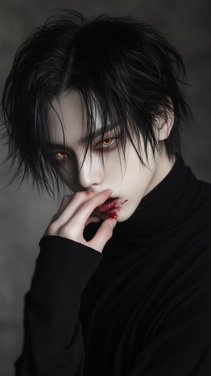 Создано на основе запроса: Vampire, Man in his 20s, handsome like k-pop idol, thin face shape, Thin, long and torn eyes , Sanpaku Eyes with visible sclera below, Windblown Raw black hair, black turtleneck, wiping Sanguine stains from the corner of his mouth with his hand, Thinly arced lips, arrogant smile, Strategic and dangerous atmosphere, Ultra-realistic, cinematic lighting, photorealistic, 8K, high-detail, depth of field