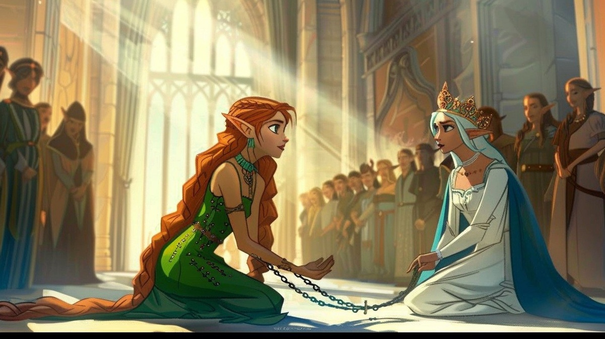Создано на основе запроса: Finnuala, a twenty-something elf girl with red hair and green eyes. She is wearing a brief ragged green tunic and is barefoot, on a collar and chain kneeling on the floor. Queen Isolde, A blonde, blue-eyed, imperious-looking royal in a gem-encrusted gown and an ornate gold crown, is holding the other end of the chain while courtiers look on in a wide palace room. --- Автоперевод: Finnuala, двадцать с чем-то девушкой-эльфом с рыжими волосами и зелеными глазами. Отлично выглядит? 🤔 https://dzen.ru/id/65c0c65c86e4f837c27b24d7 #ИИ #AI #нейросеть #midjourney #art