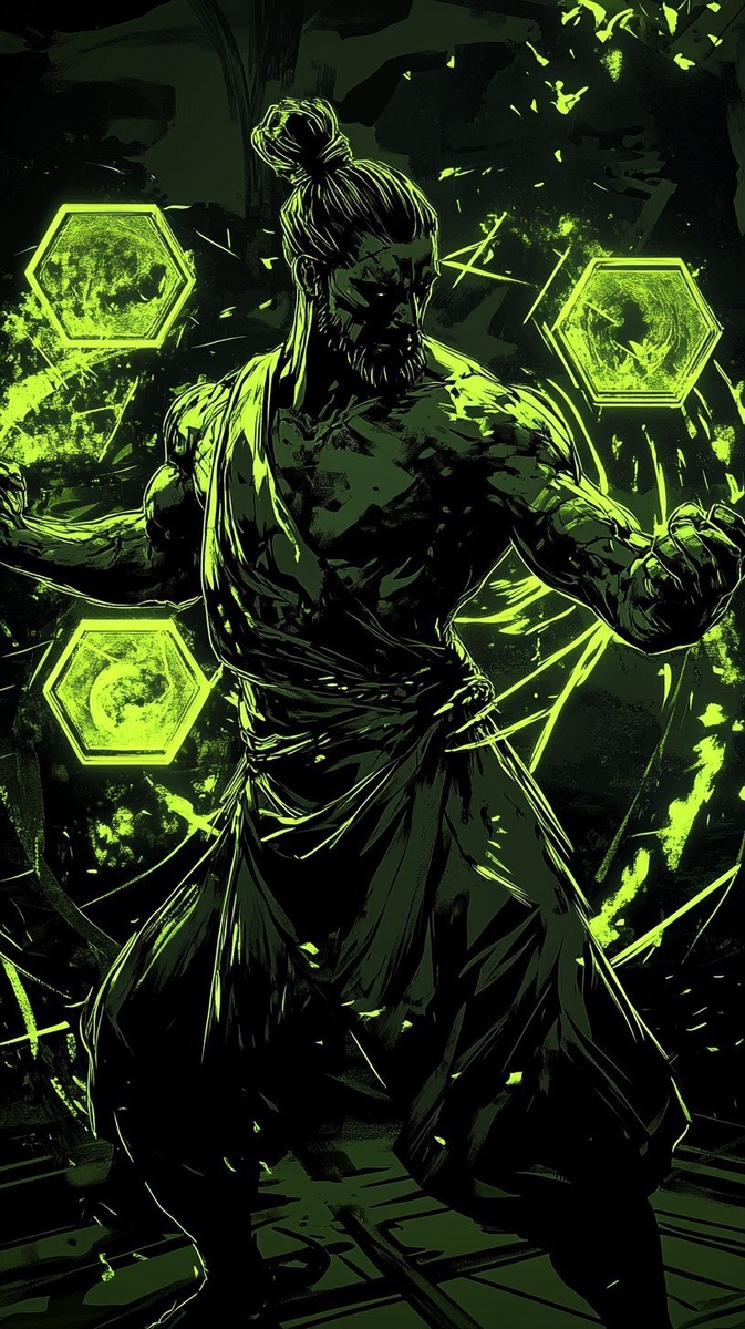 Создано на основе запроса: the tale of two tao pies, the tao of two pies juggles 4 hexagon shaped neon smoke outlines, dressed in monk battle robes, shaved head except for a long topknot, lean and muscler, open toed sandals