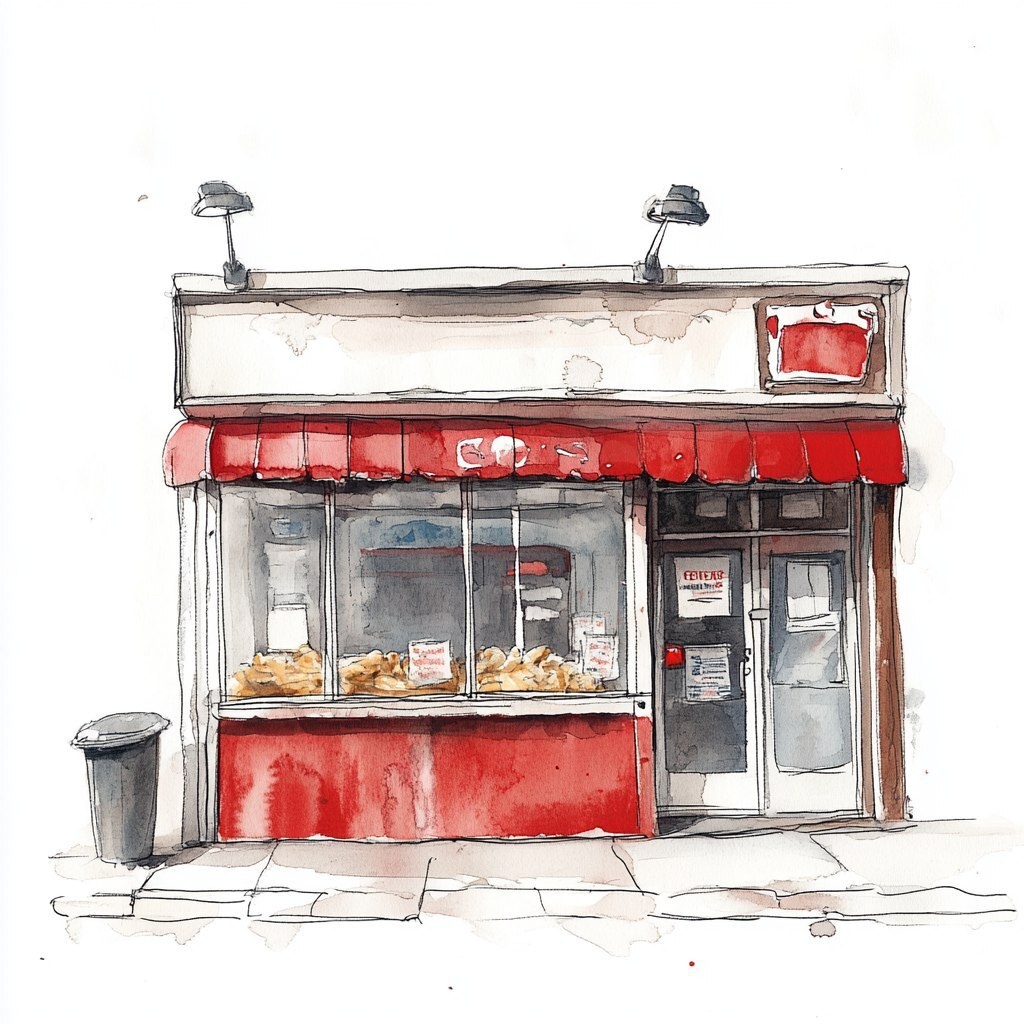 Создано на основе запроса: A watercolour drawing of a chip shop, high resolution, white background