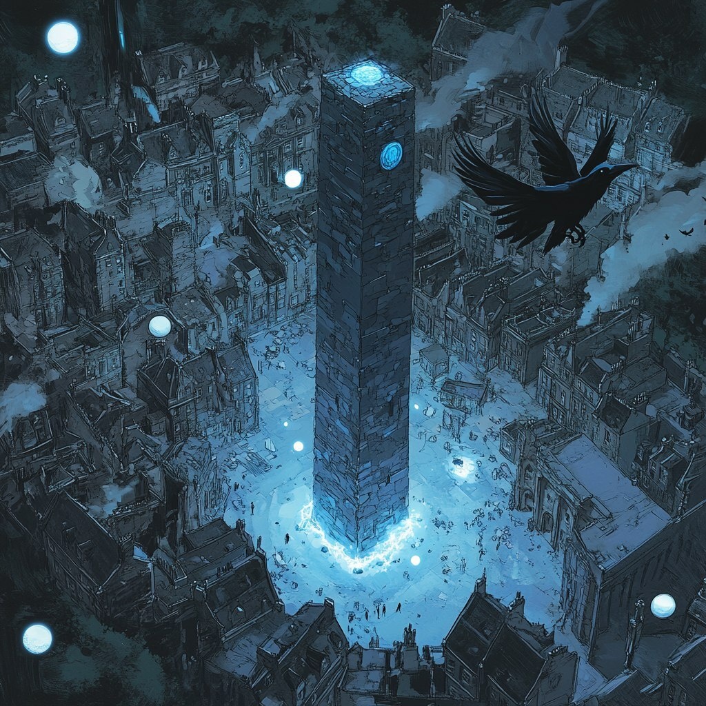 Создано на основе запроса: an ariel view of modern edinburgh. The city is being covered by a slowly encroaching decay. There is a tall stone monolith in the center of the city. The monolith is faintly glowing blue. The area around the monolith is not decayed. There are white pearlescent orbs in the air around across the city. Flying above the city is a single semi realistic cartoon raven.