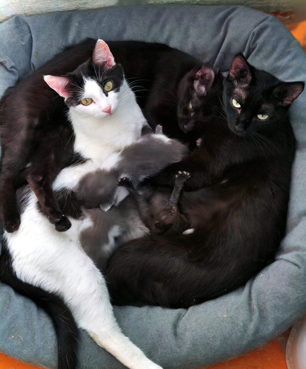 Нам подкинули сюрприз… в виде пятерых крошечных комочков прямо под двери в коробке! Эти малыши ещё даже не умеют кушать сами — только-только открыли глазки. Если бы не наша заботливая Алиса, которая сразу стала для них приёмной мамой, всё могло бы закончиться печально… Но теперь у котят есть целая команда нянек — другие наши кошечки помогают за ними ухаживать! Так и живём: три девочки и два мальчика — куда их теперь девать? 😅 На фото вы можете увидеть двух чёрных красавиц — Виту и Багиру и беленькую с черными пятнами Алису, которые нежно опекают своих приёмных малышей. ❤️ Кто готов помочь с поддержкой или забрать одного из этих ангелочек в будущем? Делимся теплом и котоновостями! 🐾 #котомафия #спасениекотят #добрыедела Если вы хотите сделать подарок для наших котиков, то можете заказать и отправить им корма, капли инспектор, лакомства, игрушки, лежанки, домики с Озона или Вайлдберисе нам это очень нужно, так как мы обычно, ничего себе не можем позволить кроме кормов! Адреса