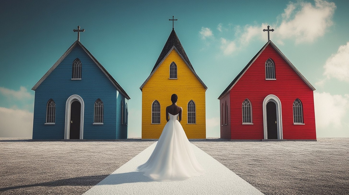 Создано на основе запроса: three churches next to eachother with an african amercian bride walking towards them
