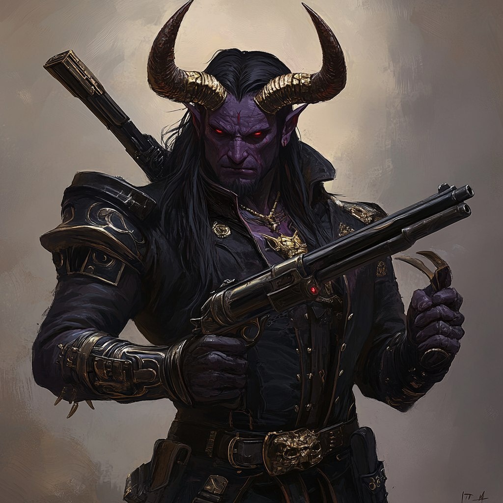 Автоперевод: Старый мужской тифлинт с рогами, пурпурной кожей, черной доспехи, с двумя ружками, длинными черными волосами, красными глазами