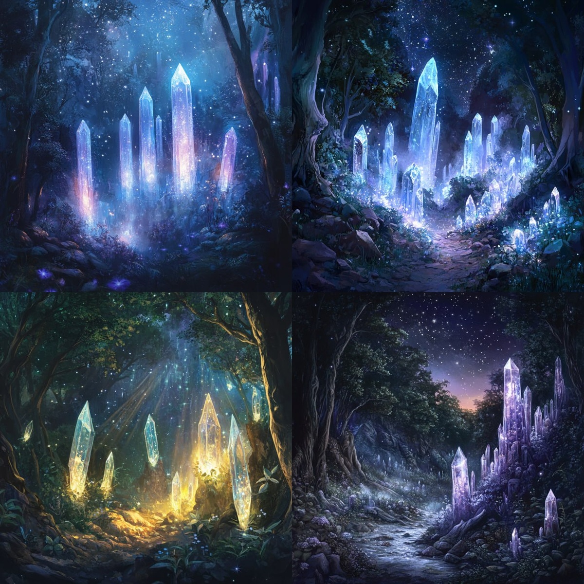 Пример промта:"Mystical forest, glowing crystals, shimmering mist, starry sky, mythical creatures, magical light"