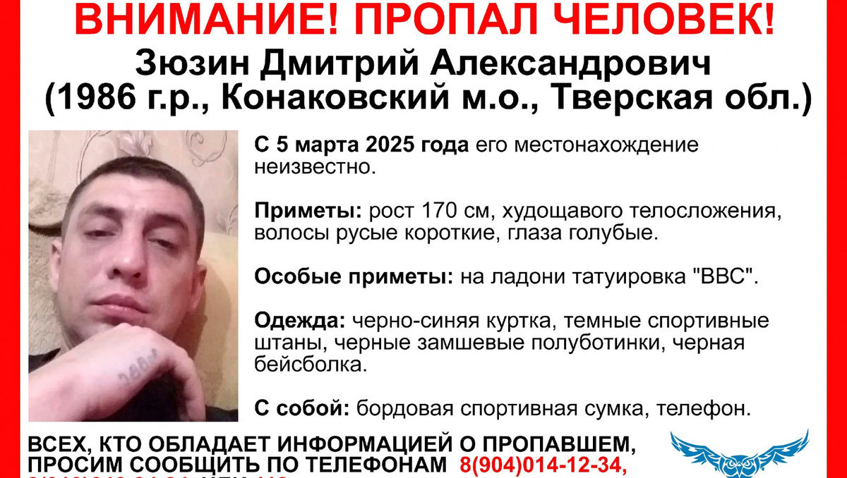 В Конаковском округе Тверской области пропал Дмитрий Александрович Зюзин 1986 года рождения. Как сообщает тверской волонтерский поисково-спасательный отряд "Сова", с 5 марта 2025 года его местонахождение неизвестно.